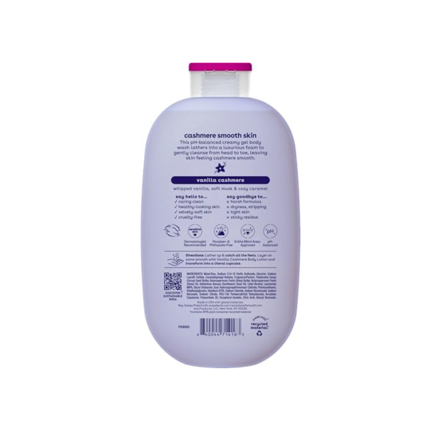A creamy daily body wash from EOS that helps cleanse the skin gently while leaving it feeling soft, refreshed, and comforted after every shower. Infused with the warm, cozy scent of Vanilla Cashmere, this body wash transforms your routine into a more luxurious experience while helping maintain soft, smooth-feeling skin.